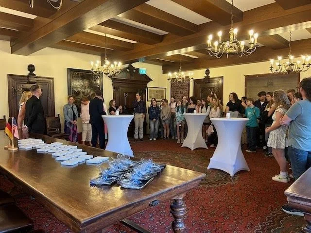The students were also hosted at Celle City Hall, where they toured the city’s historic Ratsherrensaal (Council Chamber), a meeting space dating back more than 400 years. During the visit, they were welcomed by Jannis Timm and Mayor Dr. Jörg Nigge, who shared insights about local government and Celle’s long history as a center of culture and commerce.